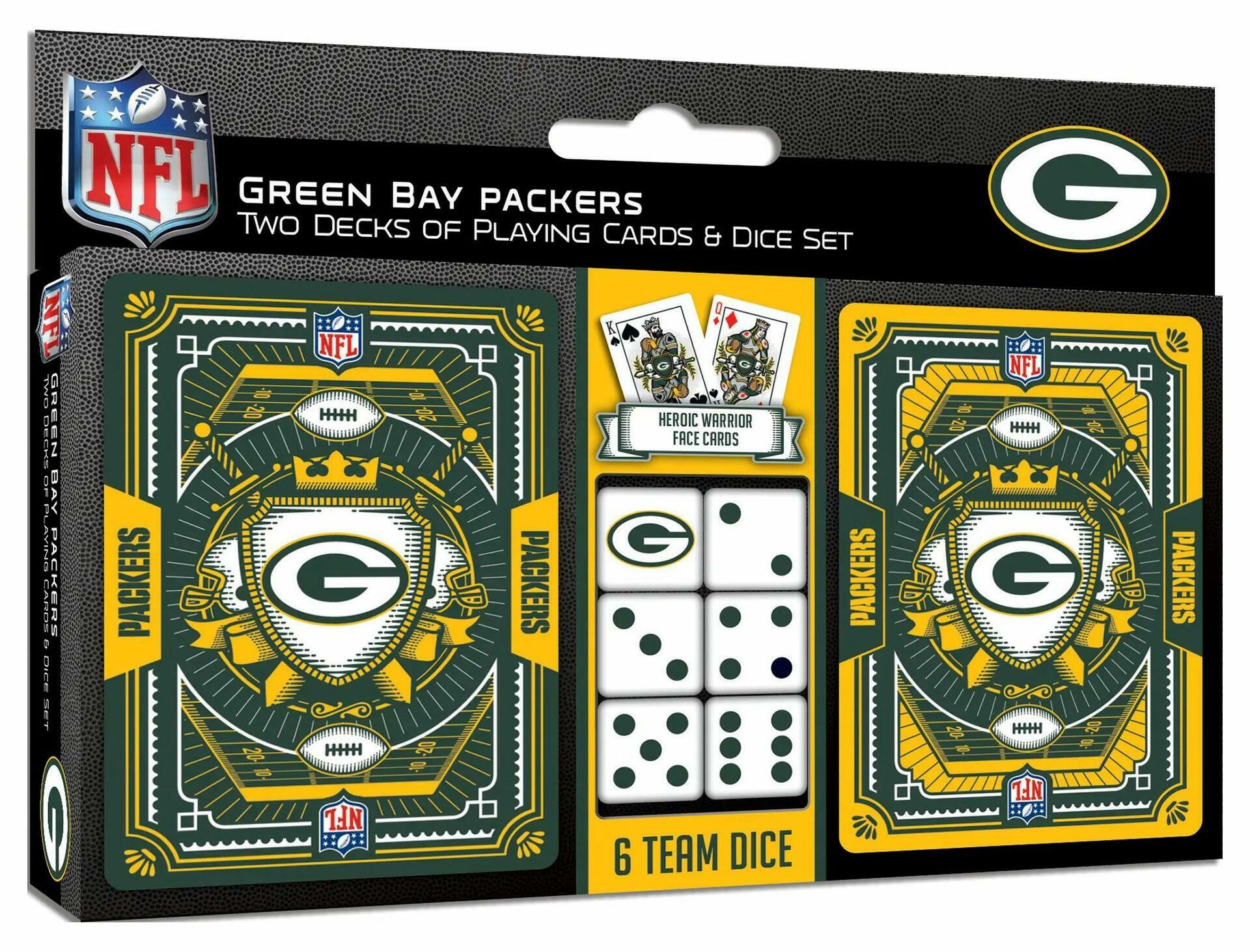 Show your team spirit with this officially licensed NFL Green Bay Packers 2-pack playing cards and dice set, perfect for mens Green Bay Packers gifts and gifts for packers fans. Each set includes two decks of poker-size playing cards (3.5" x 2.5") featuring custom Green Bay Packers designs on all face cards, Jokers, and Ace of Spades, making it a standout among Green Bay Packers gift set options. The set also comes with five standard-size dice, ideal for game nights, tailgates, or adding to your Green Bay Packers decor. Designed for adults and families, this NFL deck of playing cards is a must-have for any fans collection of Green Bay Packers merch. The cards and dice are housed in a compact package, making them easy to store or take on the go. Whether youre looking for Green Bay playing cards to enhance your game room or searching for unique Green Bay Packers gifts, this set delivers quality and team pride. Makes a thoughtful addition to any Green Bay Packers bar cups or Green Bay Packers shot glass set for the ultimate fan experience.